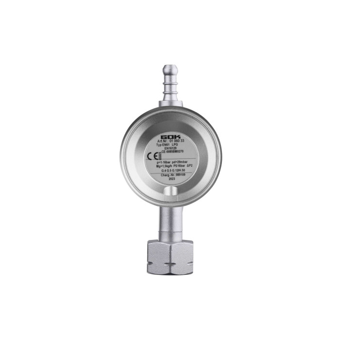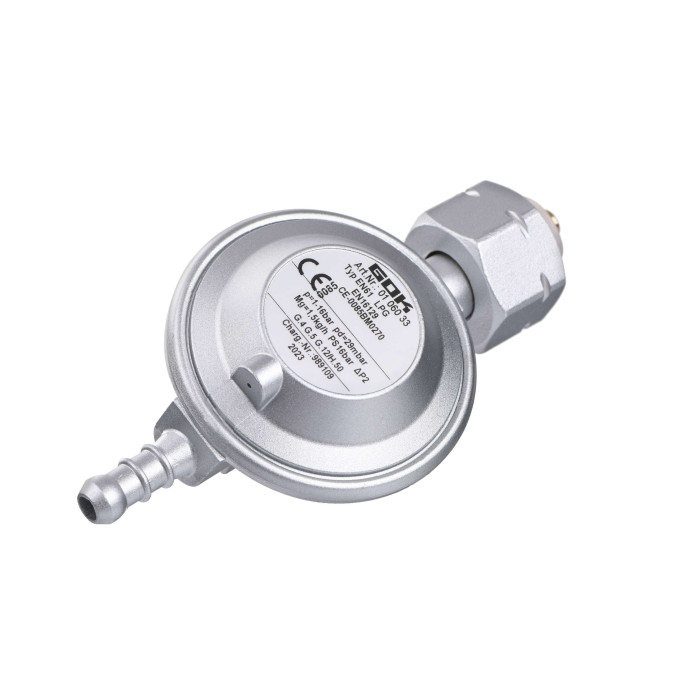 Газовый редуктор GOK для универсального подключения к газовым баллонам. Предназначен для регулирования давления в бытовых, кемпинговых и профессиональных устройствах невысокой мощности.