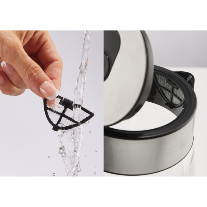 Благодаря большому объему чайника Gorenje K17TRG 1,7 литра вы сможете вскипятить воду сразу на всю семью. Также очень удобно, если к вам в гости пришла большая компания друзей. Качественный фильтр от накипи легко снимается и моется. Кроме того, он предотвращает капание воды во время наливания в чашку. Шнур питания подключается к подставке, чтобы вы могли свободно пользоваться чайником. В подставке есть специальное отделение для удобного хранения шнура. Если в чайнике мало воды или она закончилась, нагрев автоматически выключается. Кроме того, чайник выключается, когда вода закипает.