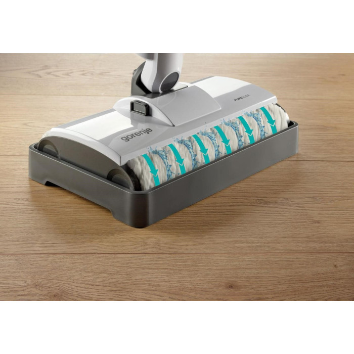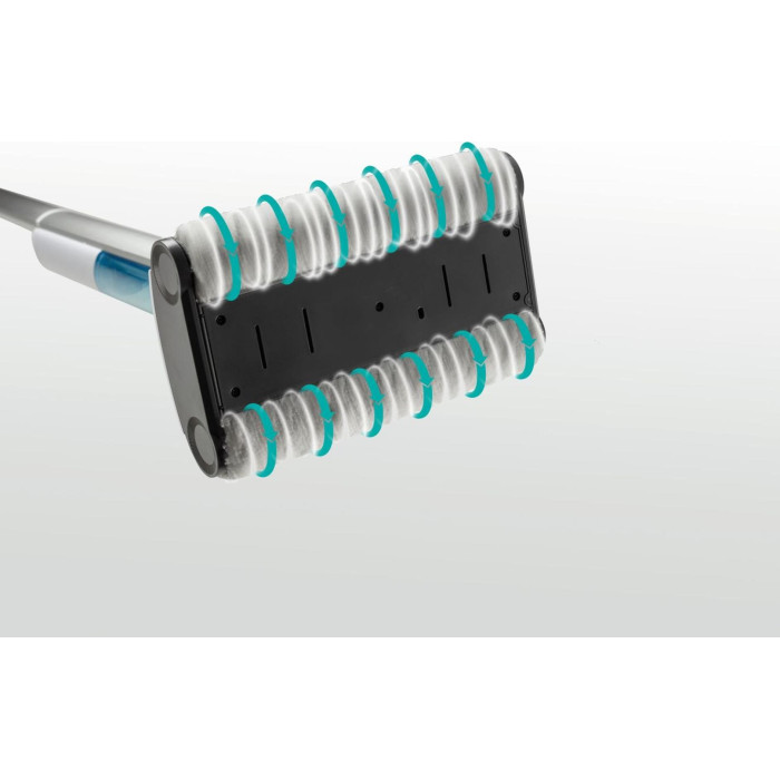 Две роликовые щетки, которые вращаются в двух направлениях, распыляют воду таким образом, чтобы твердый пол высох быстро, а вы не поскользнулись и не упали. Поскольку используется только чистая вода, то никакой химикат не навредит окружающей среде, а уборка будет происходить максимально экологично