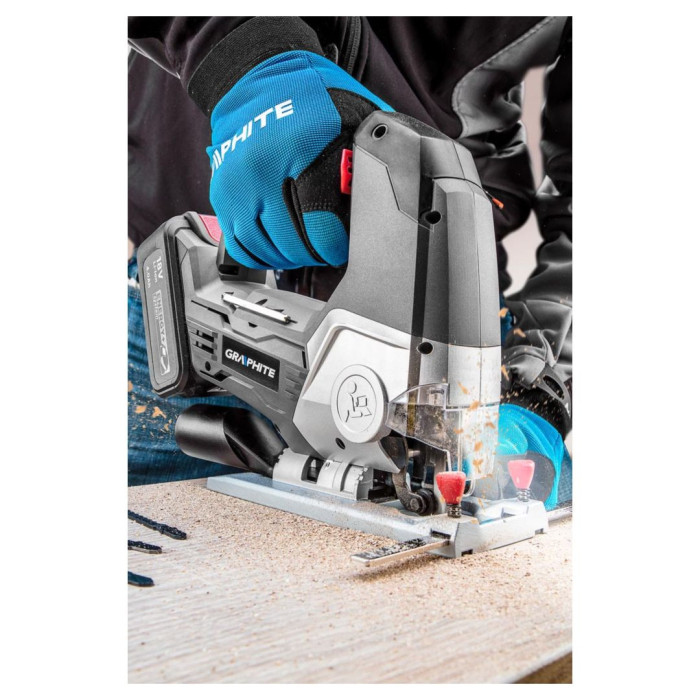 Электрический лобзик GRAPHITE, совместимый с аккумуляторами 18 В, Li-Ion, GRAPHITE Energy+. Оборудование предназначено для точной и быстрой резки по дереву и металлу максимальной толщиной, соответственно, 80 мм и 10 мм. Система регулировки скорости вращения позволяет работать со скоростью от 0 до 2400 ходов в минуту. Электролобзик имеет алюминиевую устойчивую раму с возможностью регулировки угла наклона в диапазоне от 0° до 45° вправо и влево. Имеет функцию 3-ступенчатой регулировки величины маятникового хода, которая позволяет ускорить скорость резки в выбранных материалах.