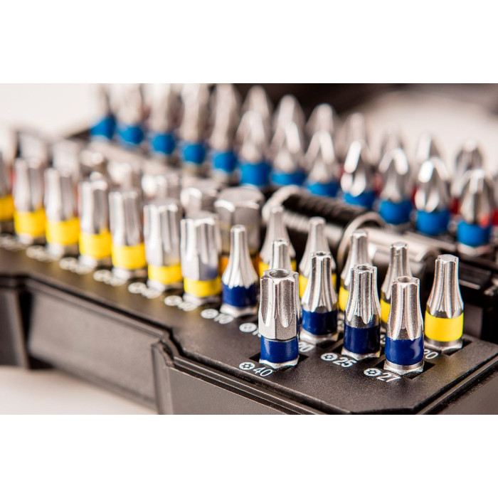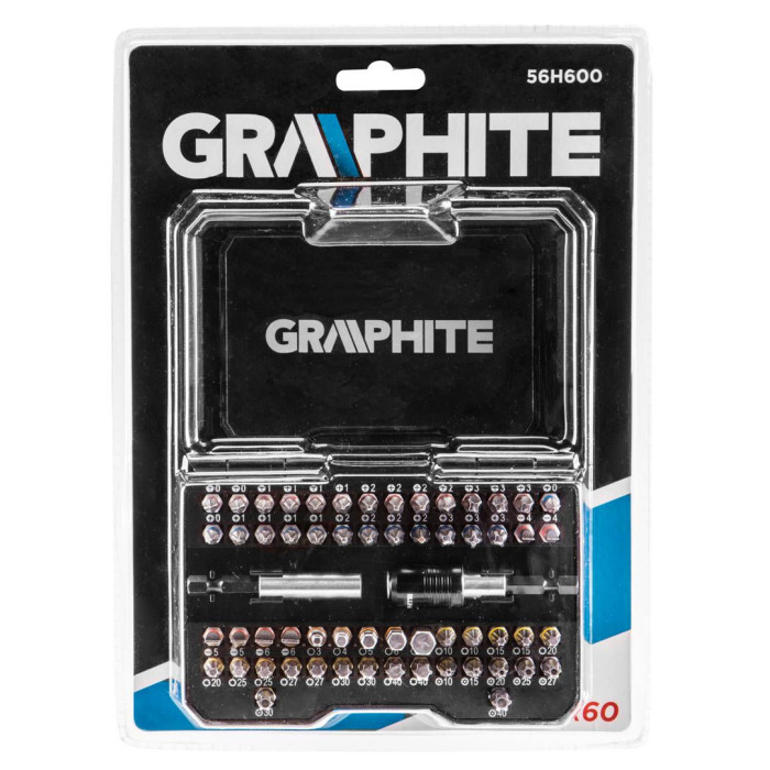 Великий універсальний набір наконечників GRAPHITE (арт. 56H600), який містить різноманітні види наконечників-бітів для загвинчування. Найбільш затребувані розміри (PH2, PZ2 ..) повторені кілька разів.