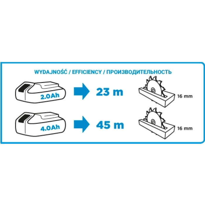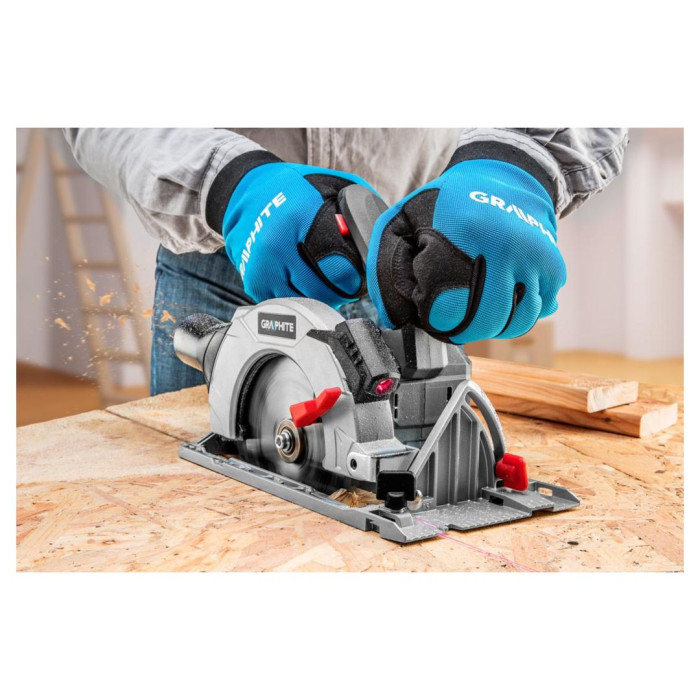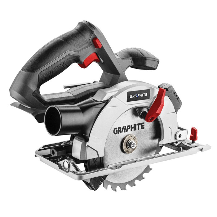 Дискова пилка GRAPHITE, сумісна з акумуляторами 18 В, Li-Ion, GRAPHITE Energy+. Пилка дозволяє виконувати різання під кутом у діапазоні від 0° до 45°. Максимальна товщина розпилюваного матеріалу складає 48 мм. Регулювання кута і глибини різання не вимагає використання інструментів. Пилка сумісна з різальними дисками зовнішнім діаметром 150 мм і діаметром отвору 10 мм. Швидкість обертання диска на яловому ході складає 4200 об./хв. Пилку обладнано ручкою з блокуванням від випадкового ввімкнення, яка вкрита протиковзаючим пластиком, завдяки якому робота нею є зручною та безпечною. Опірна рамка та верхній кожух виготовлені з міцного сплаву алюмінію. Пилка постачається у комплекті з напрямною для поздовжнього різання та торцевим ключем.