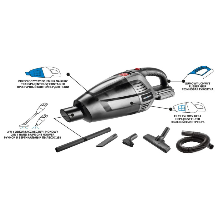 Акумуляторний пилосос 2-в-1 GRAPHITE 58G097 є частиною серії інструментів Energy+, що працюють від 18В Li-Ion акумуляторів (не входять у комплект). Цей універсальний пристрій поєднує функції вертикального та ручного пилососа, забезпечуючи ефективне прибирання в будинку, гаражі або майстерні.