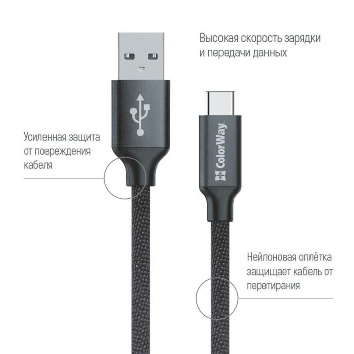 Кабель ColorWay - це універсальний кабель з термополіуретану і нейлону, який підходить для смартфонів, планшетів та інших пристроїв, оснащених роз"ємами USB і Type-C. Забезпечує можливість швидкої передачі даних, а також дозволяє заряджати будь-який сумісний пристрій через USB-порт.
