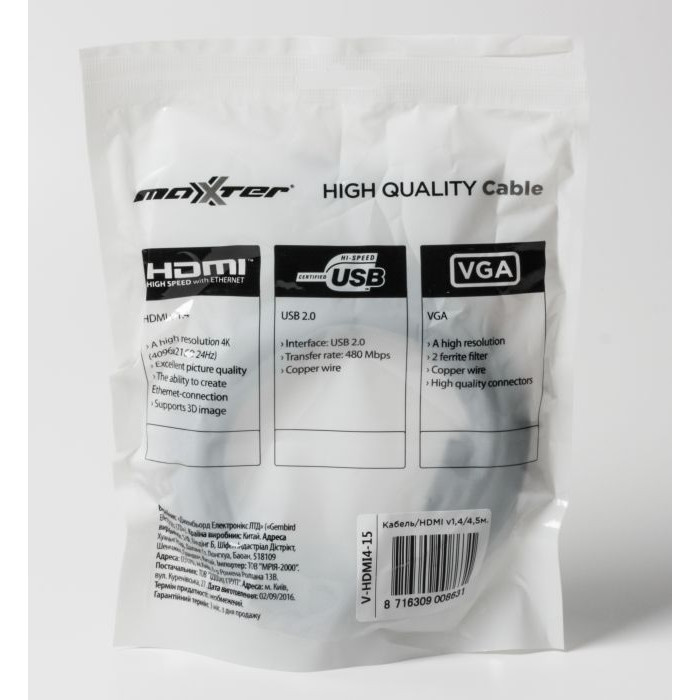Кабель Maxxter HDMI - HDMI V 1.4 (M/M), 4.5 м, чорний (V-HDMI4-15) пакет