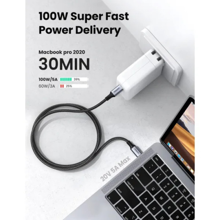 Кабель UGREEN US316 підтримує швидке заряджання PD до 100 Вт 20 В/5 А (макс.), 15 В/3 А, 12 В/3 А, 9 В/3 А, 5 В/3 А з адаптерами живлення USB-C, такими як PD 18 Вт/30 Вт/45 Вт/60 Вт/61 Вт/87 Вт/96 Вт. Він також підтримує протокол Huawei FCP, Qualcomm QC 3.0 та Xiaomi Fast Charge. Повна зарядка MacBook Pro 15" займає всього 112 хвилин, так само швидко, як і оригінальний зарядний кабель. Крім того, він також підтримує швидкість передачі даних до 480 Мбіт/с, файли 1G будуть передані за 25 секунд.УНІВЕРСАЛЬНА СУМІСНІСТЬЦей кабель для швидкого заряджання USB C PD сумісний з усіма пристроями Type-C, такими як MacBook Pro 13 дюймів 15 дюймів 16 дюймів 2017 2018 2019, новий MacBook Air, MacBook Retina, iMac, Mac Mini, Google Chromebook Pixel, D 13/15, Surface. Pro 7, 2018 iPad Pro 12,9 "/11", Huawei P30, P20 Pro, P10, Mate10; Samsung S10, S10 Plus, S9, S8, Note 10 9 8, A70; Xiaomi Mi 9, A2; HTC U11 10, LG G5 G6, OnePlus 5T, 6, Google Pixel 2, 2XL, Nexus 5X, 6P, GoPro Hero 7/6/5, Nintendo Switch, Razer Phone і т.д.МІЦНИЙВін оснащений посиленими роз'ємами на обох кінцях, витримує понад 10 000 випробувань на вигин завдяки високій міцності та гарної ударної стійкості.БЕЗПЕЧНИЙ ТА НАДІЙНИЙЦей USB-кабель US316 також має вбудований захист від перевантаження по струму/перегріву/короткому замиканню та багатошарове екранування з підтягуючим резистором 56 Ом усередині, що забезпечує безпечне та стабільне джерело живлення. Найкращий варіант економічного кабелю для швидкого заряджання та синхронізації даних з USB-C на USB-C для повсякденного використання.