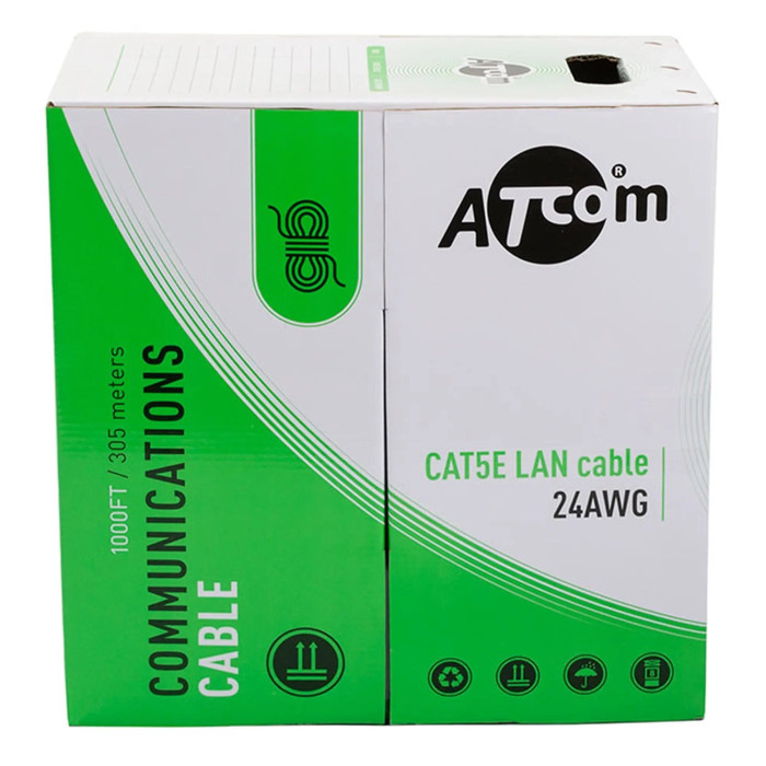 Вита пара Atcom Standard FTP Lan cable CAT5E (FTP 0,48mm CCA за бухту 305 м) фольгована вита пара (англ. FTP - Foiled twisted pair), також відома як F / UTP) - присутній один загальний зовнішній екран у вигляді фольги. CAT5e (смуга частот 125 МГц) - 4-парний кабель, вдосконалена категорія 5. Швидкість передач даних до 100 Мбіт / с при використанні 2 пар і до 1000 Мбіт / с при використанні 4 пар. Кабель категорії 5e є найпоширенішим і використовується для побудови комп"ютерних мереж. Іноді зустрічається двохпарний кабель категорії 5e. Кабель забезпечує швидкість передач даних до 100 Мбіт / с. Переваги даного кабелю в нижчій собівартості і меншою товщиною.Товщина ізоляції провідника - близько 0,2 мм, матеріал зазвичай полівінілхлорид (англійське скорочення PVC), для більш якісних зразків 5 категорії - поліпропілен (PP), поліетилен (PE).