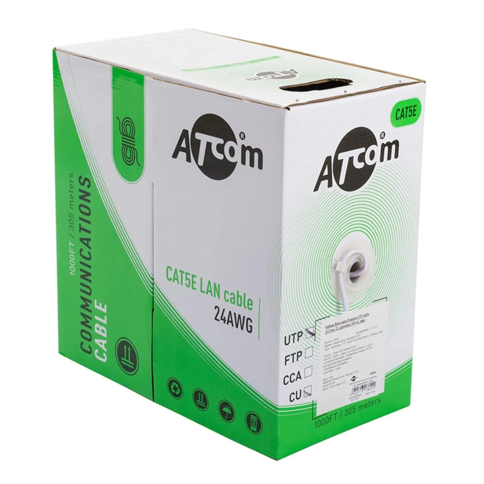 Вита пара Atcom Premium FTP Lan cable CAT5E (UTP 0,5mm CU за бухту 305 м) фольгована вита пара (англ. FTP - Foiled twisted pair), також відома як F / UTP) - присутній один загальний зовнішній екран у вигляді фольги. CAT5e (смуга частот 125 МГц) - 4-парний кабель, вдосконалена категорія 5. Швидкість передач даних до 100 Мбіт / с при використанні 2 пар і до 1000 Мбіт / с при використанні 4 пар. Кабель категорії 5e є найпоширенішим і використовується для побудови комп"ютерних мереж. Іноді зустрічається двохпарний кабель категорії 5e. Кабель забезпечує швидкість передач даних до 100 Мбіт / с.Переваги даного кабелю в нижчій собівартості і меншою товщиною. Товщина ізоляції провідника - близько 0,2 мм, матеріал зазвичай полівінілхлорид (англійське скорочення PVC), для більш якісних зразків 5 категорії - поліпропілен (PP), поліетилен (PE).