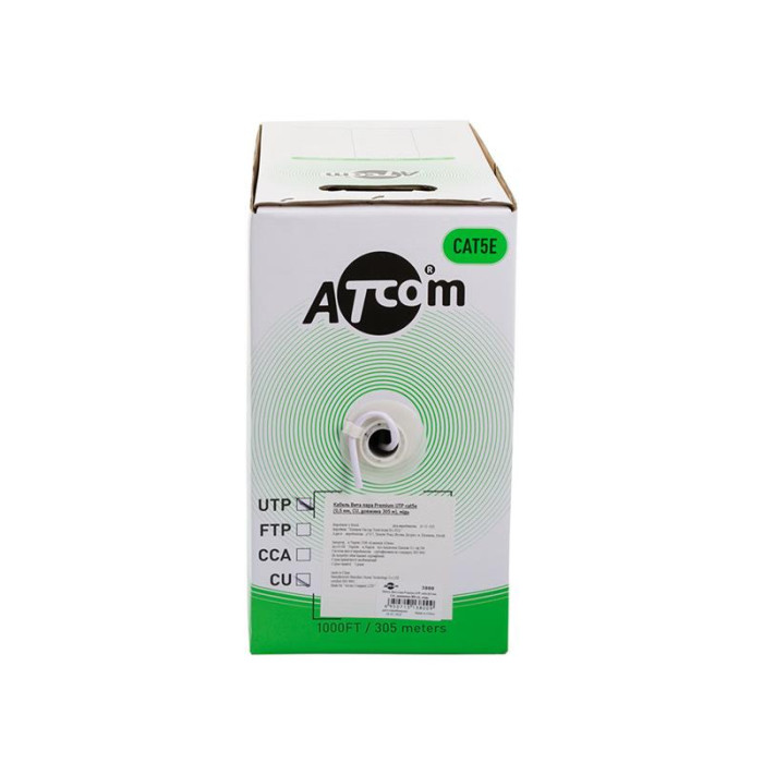 Кабель UTP 305м cat.5e Standart CCA Atcom (3799) на основі витої пари для внутрішньої прокладки має поліпшені характеристики в умовах зниженої температури і впливу ультрафіолету. Кабелі для зовнішньої прокладки виконані на основі поліетиленової (PE) ізоляції. Цей кабель може працювати в більш широкому діапазоні температур, захищений від впливу дощу і грунтових вод. Але через високий ступінь горючості і поширення вогню даний тип кабелю не рекомендується використовувати всередині приміщень.