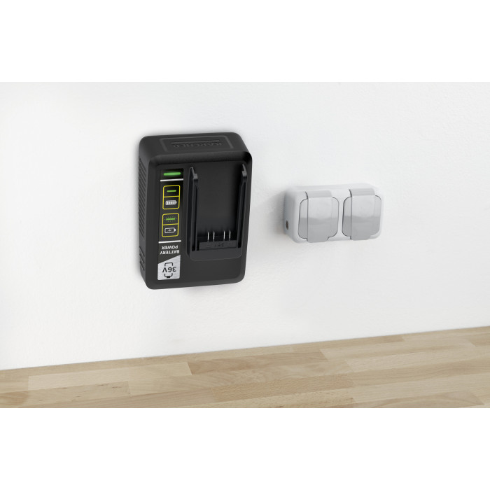 Швидкозарядний комплект Battery Power 36/50 Складається зі змінного акумулятора на 36 В / 5,0 Ач. і швидкозарядного пристрою на 36 В. Підходить для використання у всіх пристроях на акумуляторної платформі Kärcher 36 В.