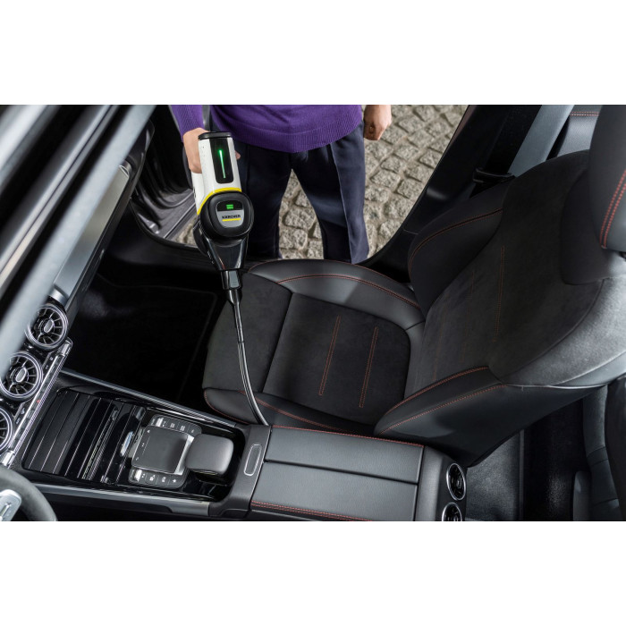 Ручний пилосос Kärcher VC 7 Cordless yourMax Car вражає досконалими технологіями, широким оснащенням і зручністю в управлінні. Інноваційний датчик запиленості розпізнає забруднення і регулює силу всмоктування для ефективного використання енергії акумулятора і тривалого прибирання від одного заряду (до 60 хв). Потужний (350 Вт) безщітковий двигун постійного струму, що живиться від акумулятора напругою 25,2 В, забезпечує високу силу всмоктування, яка може бути додатково збільшена натисканням кнопки (режим Boost). Моторизована насадка для підлоги зі світлодіодним підсвічуванням ретельно очищає як тверді покриття для підлоги, так і килими. Іншими перевагами є надзвичайна простота спустошення контейнера для збору сміття, ергономічна конструкція апарата, що підходить для прибирання у важкодоступних місцях, і наочний індикатор стану заряду акумулятора.