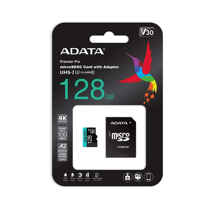 За рахунок впровадження високошвидкісних характеристик UHS-I U3, карти пам'яті Premier Pro підтримують запис відео високої роздільної здатності Full HD, 3D і 4K Ultra HD . Вони відповідають класу V30 (клас швидкості відео), що означає, що ці карти пам'яті можуть записувати відео зі швидкістю 30 Мб в секунду.Це більше, ніж потрібно для запису відео у форматі Ultra HD 4K! Карти пам'яті Premier Pro мають швидкість запису до 85 Мб / с, що значно зменшує час редагування, завантаження або передачі великих файлів між пристроями.Ці карти також підтримують режим серійної фотозйомки для збереження кожного прекрасного моменту! Карти пам'яті Premier Pro microSDXC / SDHC UHS-I U3 забезпечують підвищені характеристики швидкості читання / запису до 100/85 Мб / с, що дозволяє знімати відео і зображення з високою роздільною здатністю.Вони мають клас V30 (клас швидкості відео) і підтримують запис відео формату Ultra HD 4K. Завдяки обсягу 128 Гб пам'яті Premier Pro розширюють розміри сховища мобільних пристроїв і дозволяють користувачам зберігати тисячі фотографій і більше години відео в форматі 4K Ultra HD.Універсальність карт пам'яті Premier Pro забезпечує роботу зі смартфонами, планшетами, цифровими камерами, ноутбуками та відеомагнітофонами — завдяки SD-адаптеру, що входить в комплект.Карти пам'яті Premier Pro оснащені технологією виправлення помилок для підвищення цілісності даних і мають захист високого ступеня від попадання вологи, впливу ударів, рентгенівських променів, статичної напруги та екстремальних температур. Завдяки високоякісної флеш-пам'яті MLC NAND карти пам'яті Premier Pro забезпечують прекрасні характеристики і довший термін служби. Карта пам'яті ADATA 128GB microSD class 10 UHS-I U3 A2 Premier Pro полегшують і захищають запис дорогоцінних моментів будь-якого користувача.