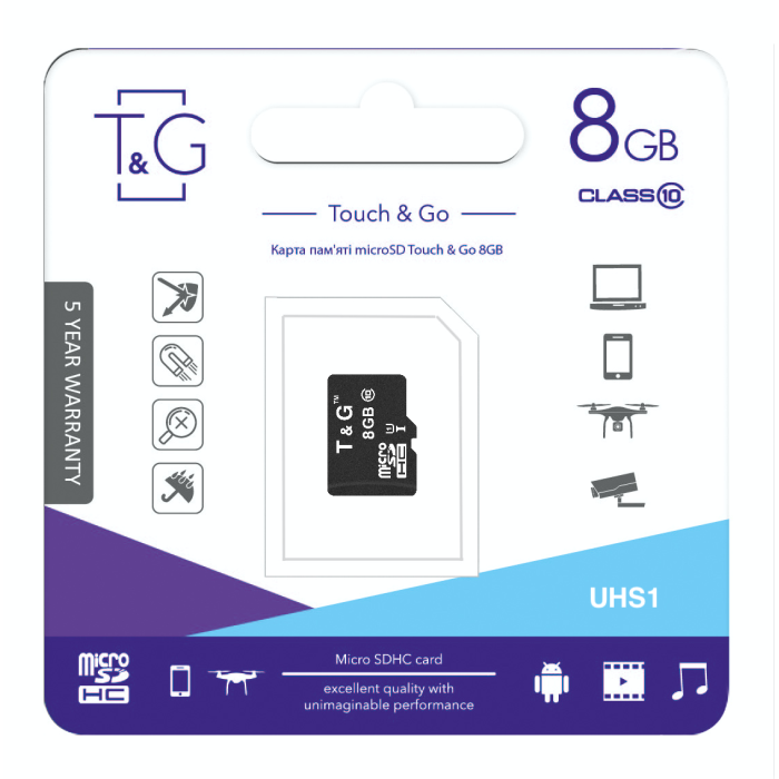Карта пам"яті T&G microSD (UHS-1) (micro SECURE DIGITAL High Capacity). Сумісна з усіма пристроями читання і запису флеш-карт стандарту microSD, такими як мобільні телефони, комунікатори, MP3-плеєра і т.п.