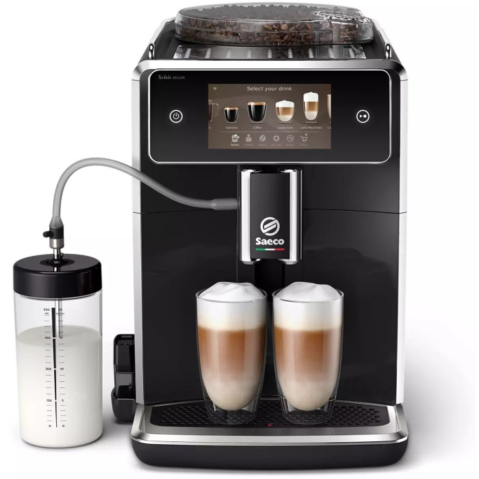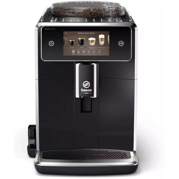 Кавомашина Saeco Xelsis Deluxe, 1,7л, зерно+мелена, автомат.капуч, авторецептів -22, чорний. 22 найвідоміших рецептів кави одним дотиком до кнопки BeanMaestro. Автоматично налаштовує параметри варильної групи для збереження аромату та смаку вибраних кавових зерен. Удосконалений 5-дюймовий кольоровий сенсорний дисплей для точного створення кавових напоїв. Вбудований модуль Wi-Fi для максимальної зручності у використанні та персональних рекомендацій щодо рецептів кави. Функція ExtraShot для подвійної інтенсивності кави. 3 налаштування смаку з CoffeeMaestro або налаштовуйте властивості кави за допомогою Coffee Equalizer на свій смак. LatteDuo: готуйте та насолоджуйтесь подвійними порціями будь-якого молочного кавового напою. LattePerfetto для густої та пишної молочної піни. Оптимальний баланс температури та аромату з Aroma Extract. 6 профілів: легко зберігайте бажані налаштування приготування. 20 000 чашок вишуканої кави з міцними керамічними жорнами. Великий герметичний контейнер для зерен, де вони залишаються свіжими. До 5000 чашок без очищення від накипу завдяки фільтру AquaClean.