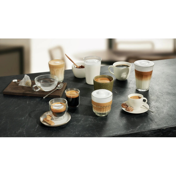автоматичний капучинатор, регульований по висоті дозатор кави/8,6 - 14,1 см, деталі можна мити в посудомийній машині:/піддон для крапель, сопло подачі напоїв, насадка для молока, трубка для молока, конт. для кавової гущі, знімний заварювальний блок, керам