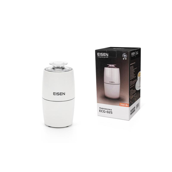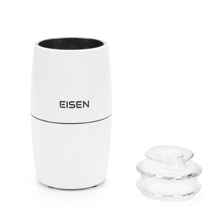 Сучасна модель кавомолки EISEN ECG-025 представлена у білому кольорі. Ергономічна форма та продуманий дизайн створюють комфортне та надійне користування приладом. Корпус виготовлений із якісного пластику, а ножі – із міцної нержавіючої сталі. Прозора кришка допомагає регулювати рівень помелу в процесі роботи пристрою. Кавомолка відрізняється компактністю та легкістю, займаючи мінімум місця на кухні.