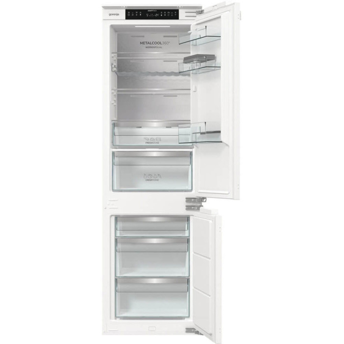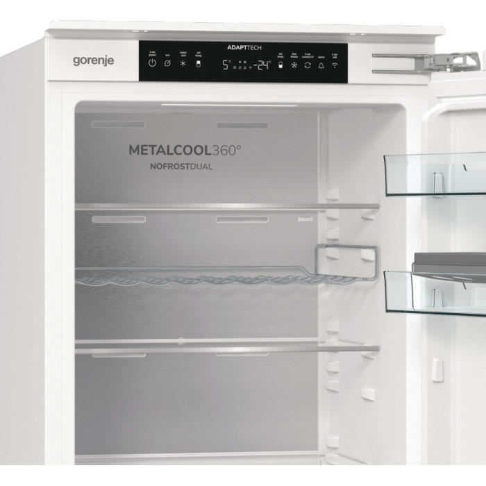 Вбудований холодильник Gorenje NRKI517E82WF поєднує холодильну та морозильну камери в корпусі висотою 177 см. Загальний корисний об’єм становить 244 л, морозильне відділення розташоване знизу. Система NoFrost Plus, адаптивне охолодження AdaptTech та зона свіжості підтримують стабільний мікроклімат для різних типів продуктів. Передбачене Wi-Fi керування та окремий світлодіодний дисплей.