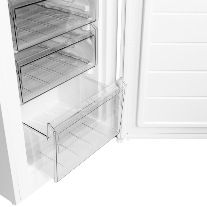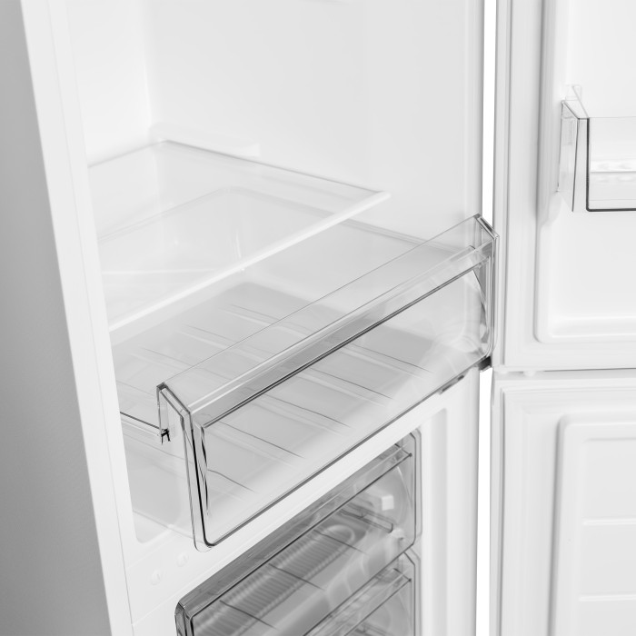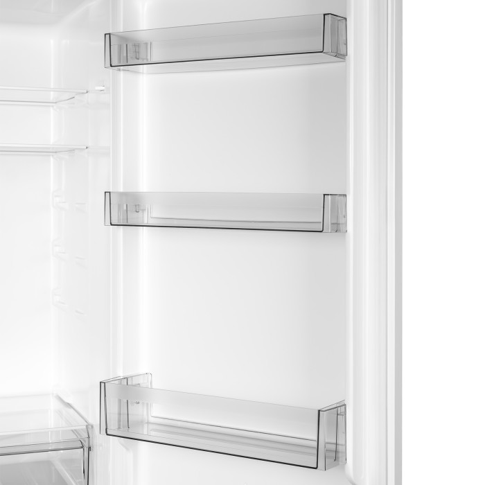 Холодильний відсік має напівпрозорий плафон лампи, що не перешкоджає LED-освітленню, яке розташоване зверху. Три полиці виконані зі скла з пластиковим окантуванням. Є три продуктові пластикові ящики, один кріспер-бокс із пластику зі скляною кришкою та пластиковим окантуванням. Морозильна камера - це три ящики для заморожування продуктів.