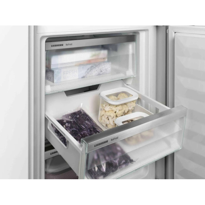 Вбудований двокамерний холодильник Liebherr із нижнім розташуванням морозильної камери поєднує систему BioFresh для тривалого збереження свіжості продуктів, технологію NoFrost у морозильнику та незалежні контури DuoCooling. Регульовані полиці, розкладна скляна панель, місткі відділення в дверцятах і ящики FrostSafe забезпечують комфортну організацію простору. Тиха робота, LED-освітлення та можливість встановлення SmartDeviceBox роблять модель зручною для сучасного дому.