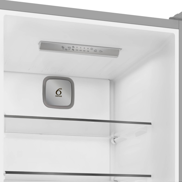 Серед додаткових функцій — режим «Еко», швидке заморожування, режим «Відпустка», а також звукові сигнали при відкритих дверцятах і підвищенні температури, що допомагає зберегти продукти у безпеці. Внутрішнє оснащення включає 4 міцні скляні полиці, 4 дверні кошики, 2 контейнери для овочів і підвісну полицю для пляшок. Все освітлюється яскравим і енергоощадним LED-підсвічуванням. Морозильна камера поділена на 3 секції, має потужність заморожування до 6 кг на добу та зберігає холод до 11 годин у разі вимкнення електроенергії.