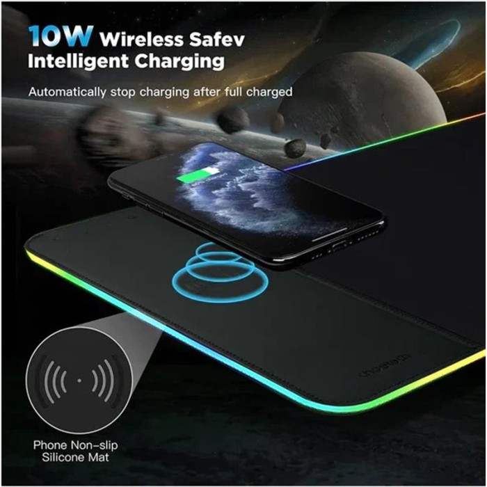 Управління в один дотик призначене для перемикання кольорів підсвічування та вимкнення. Виберіть улюблений колірний режим та насолоджуйтесь грою. неслизька основа і поверхня килимка для миші зі штучної шкіри мають пилозахисні та водонепроникні властивості. Живлення від USB-штекера та драйвер не потрібне. Одна кнопка керування дозволяє легко перемикати режими роботи світлодіодів. Просто залиште пристрої з підтримкою Qi в індукційній зоні, і вони автоматично почнуть заряджатися.