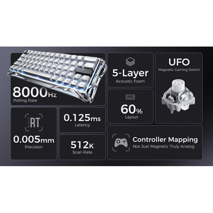 Компактна 60% клавіатура з магнітними перемикачами Hall Effect та повноцінним алюмінієвим корпусом. Забезпечує справжнє 8kHz опитування USB, затримку 0.125 мс та регулювання точки спрацьовування від 0.005 мм. Підходить для динамічних ігор, де потрібна максимальна швидкість реакції та точність.