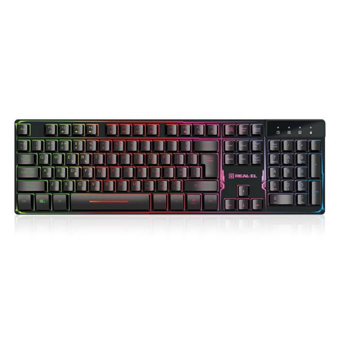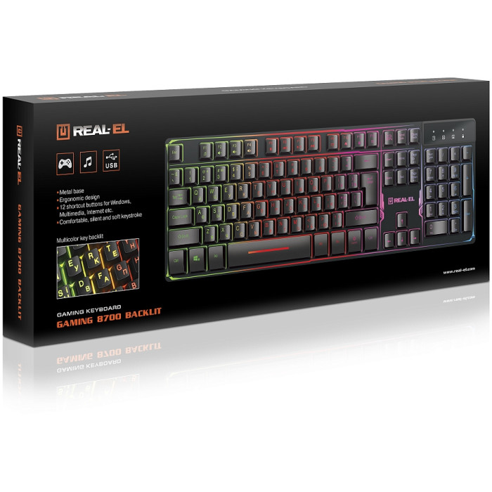 Особливістю ігрової клавіатури REAL-EL GAMING 8700 Backlit є: ергономічний ігровий дизайн, металева основа, знижений шум при роботі, тихий та чіткий хід клавіш, 12 Fn кнопок швидкого доступу до Windows, Інтернету та Мультимедіа, кабель у тканинній оплетці. Багатокольорове підсвічування клавіш з різними режимами яскравості, є режим "дихання".