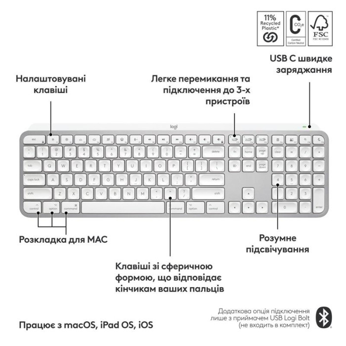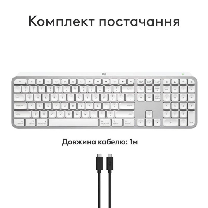 Клавіатура MX Keys працює до 10 днів при повній зарядці або до 5 місяців з вимкненою підсвіткою. Для підзарядки використовується кабель USB-C.