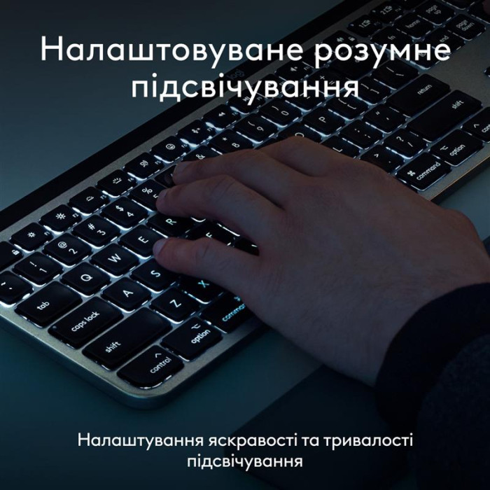 Впевнено набирайте текст на клавіатурі зі стійкими, чітко працюючими клавішами. Стійка конструкція клавіш покращує відгук і знижує рівень шуму при роботі - кожне натискання добре відчувається, не порушуючи тиші. Суцільнометалева основа забезпечує клавіатурі MX Keys додаткову міцність і стійкість на столі.