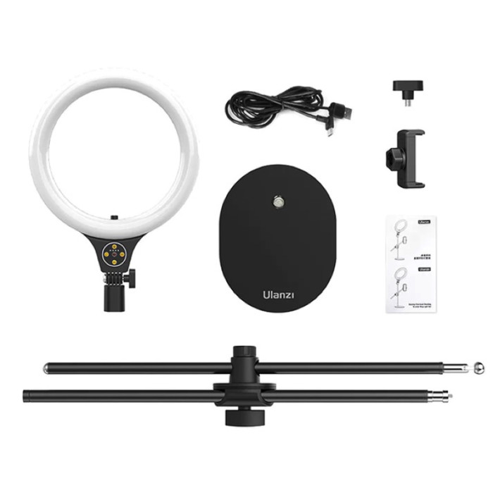 Цей 10-дюймовий Ulanzi Vijim Desktop Overhead Shooting Bracket Ring Light Set(10inch) — це світлодіодний ліхтар, який можна використовувати для прямих трансляцій, створення стилю краси, відеозаписів, фотосесій або навіть як лампу для читання. Світло має діапазон колірної температури від 3000–6500К високий CRI 95 і регулюється від 0 до 100%. У комплект входить подовжувач із регульованою висотою від 32 до 85 см для оптимального розміщення. Також в комплект входить кулькова головка, що обертається на 360°, для гнучкого позиціонування та С-подібний затискач для надійного кріплення до краю столу чи подібної поверхні.УНІВЕРСАЛЬНИЙ ІНТЕРФЕЙСT1 оснащено кнопками, що натискаються одним дотиком, для зручного керування під час регулювання освітлення. Навколо кільцевого світла два висувних інтерфейси надають більше можливостей для позицій зйомки під час прямої трансляції. Для фотозйомки краще використовувати наш комплект підставки з кільцями. Його можна використовувати під час прямих трансляцій, навчальних посібників, випікання, приготування їжі, рукоділля, малювання, каліграфії тощо. Веб-конференції, онлайн-класи, макіяж, прямі трансляції, відео — все це можна застосувати.