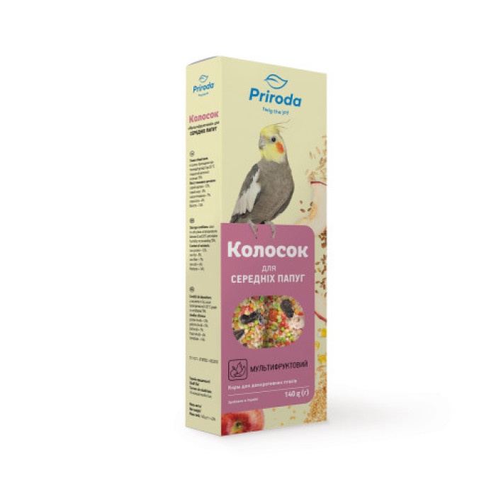Колосок «Мультифруктовий» – повноцінний вітамінізований корм та ласощі для середніх папуг. Ласощі для нерозлучників і корел за складом та поживними властивостями наближено до їжі папужок у природних умовах. Відбірні зерна та зневоднені фрукти, що входять до складу колоска, забезпечать вашого улюбленця вітамінами та поживними речовинами для хорошої кондиції та гарного настрою.