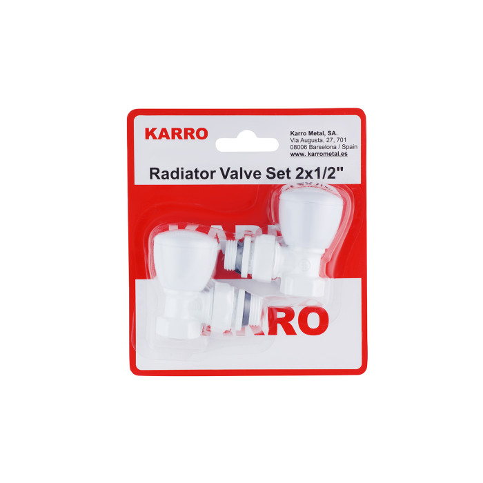 Комплект радіаторних кутових кранів верхні Karro 1/2" KR32000 білі призначений для регулювання кількості теплоносія, що надходить у батарею опалення. Запірним механізмом у них є вентиль, що дає змогу максимально точно регулювати швидкість потоку. Так само в радіаторному кутовому крані Karro варто відзначити покриття. Фарбування дає можливість з часом самостійно оновити захисне покриття виробу. При цьому комплект радіаторних кранів Карро на пів дюйма латунні. Цей сплав не схильний до іржавіння, стійкий до високого тиску і температури. Термін його служби може досягати 30 років.