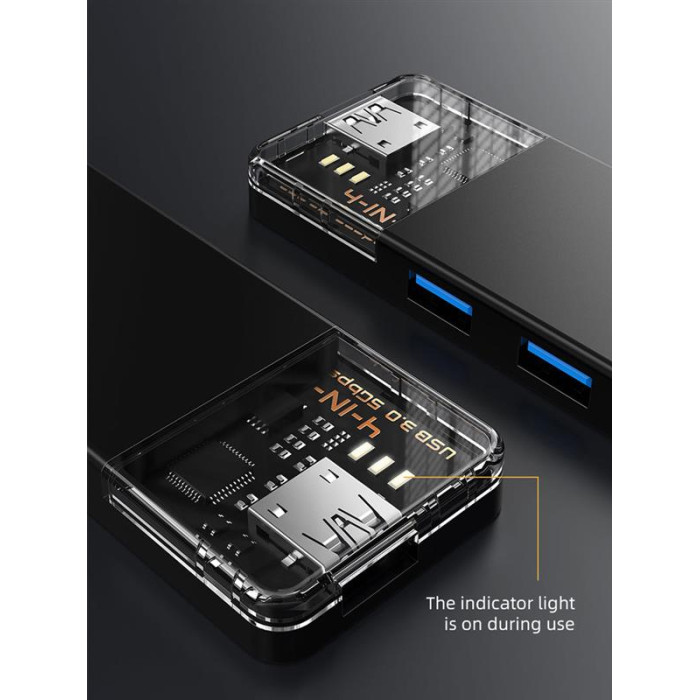 USB-хаб Cabletime USB С/A - 4 Port USB 3.0, 5Gbps, 0.15 cm (CB05B) забезпечує максимальну швидкість передачі даних до 5 Гбіт/с, дозволяючи підключати кілька USB-пристроїв, таких як клавіатури, миші або портативні пристрої зберігання даних.