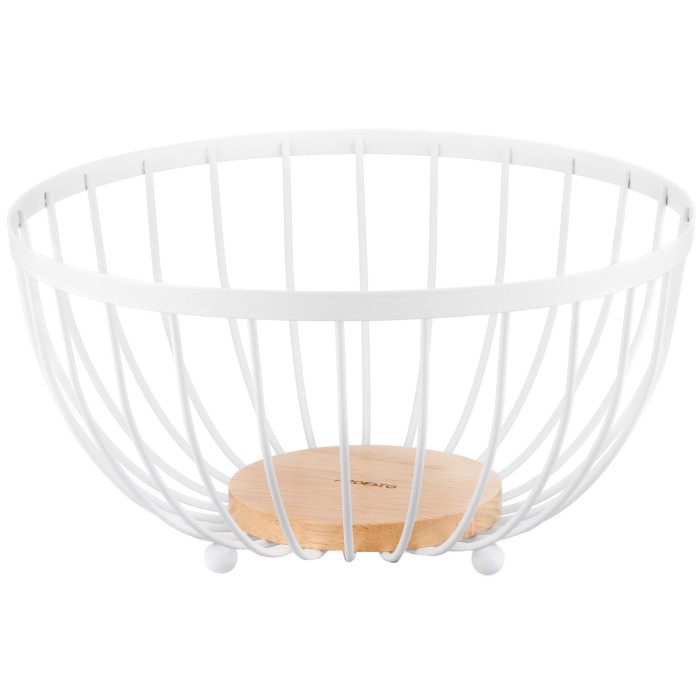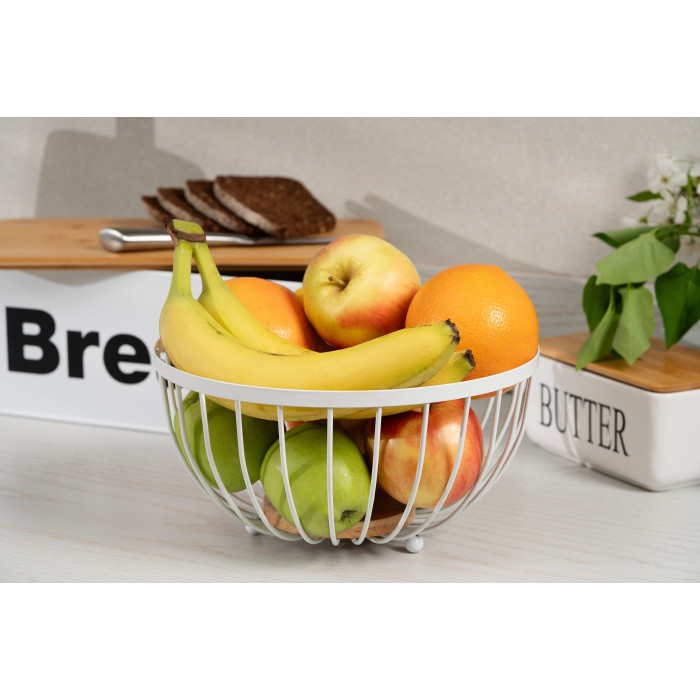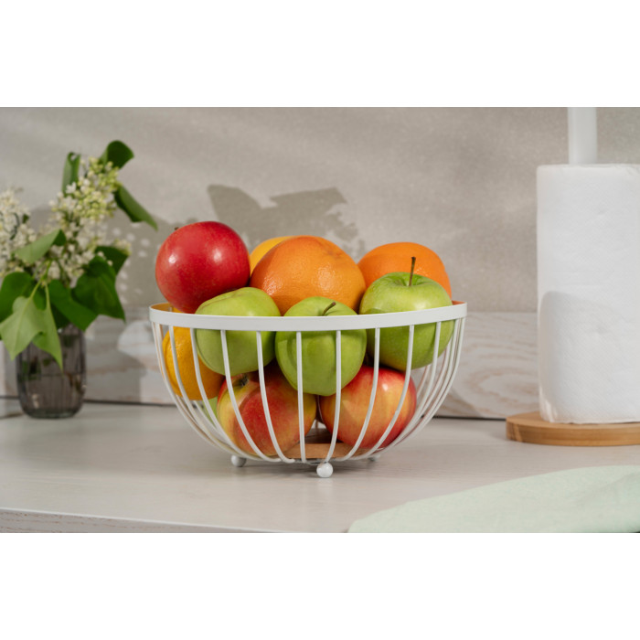 Вишуканий кошик ARDESTO Midori круглої форми стане незамінним для зберігання різних фруктів. Виріб з металу білого кольору та дерев’яною основою згодиться для дому, офісу, пікніку та на дачі. Відкрита конструкція фруктовниці забезпечує циркуляцію повітря, уповільнюючи псування продуктів. Розмір виробу становить 25 × 25 × 13, що дає змогу зберігати велику кількість фруктів. Догляд нескладний, однак не рекомендовано миття в посудомийній машині.