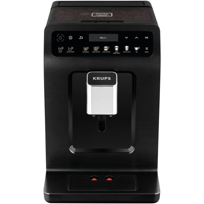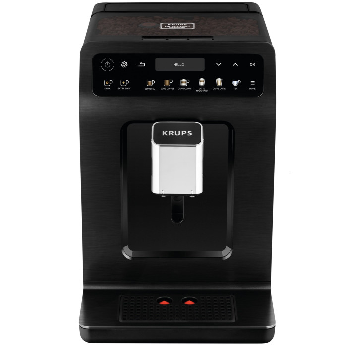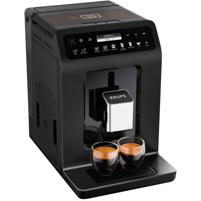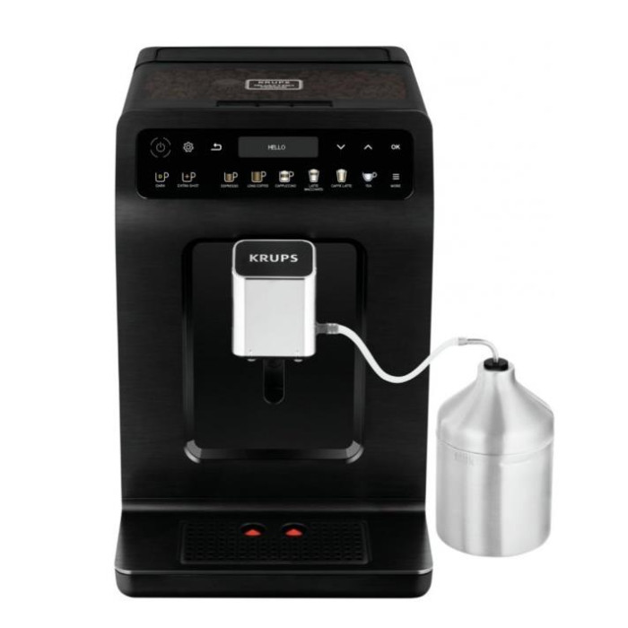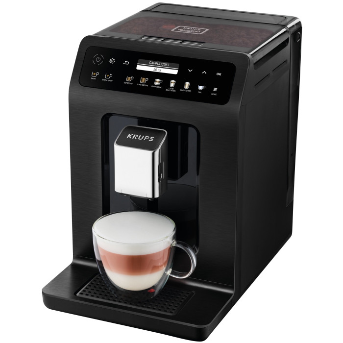 регулировка степени помола, противокапельная система, регулируемая крепость кофе, система KRUPS Quattro Force, система One-Touch-Cappuccino, индикация готовности к работе, с емкостью для молока