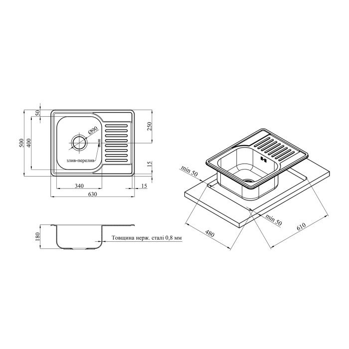 Мийка, сифон, злив-перелив, кошиковий вентиль, стрічка ущільнююча, кріплення.