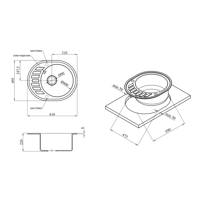 Мийка, сифон, злив-перелив, кошиковий вентиль, кріплення.