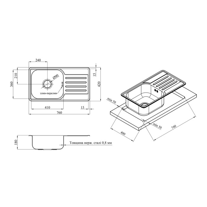 Кухонна мийка Kroner KRP Satin - 7642 (0.8 мм)
