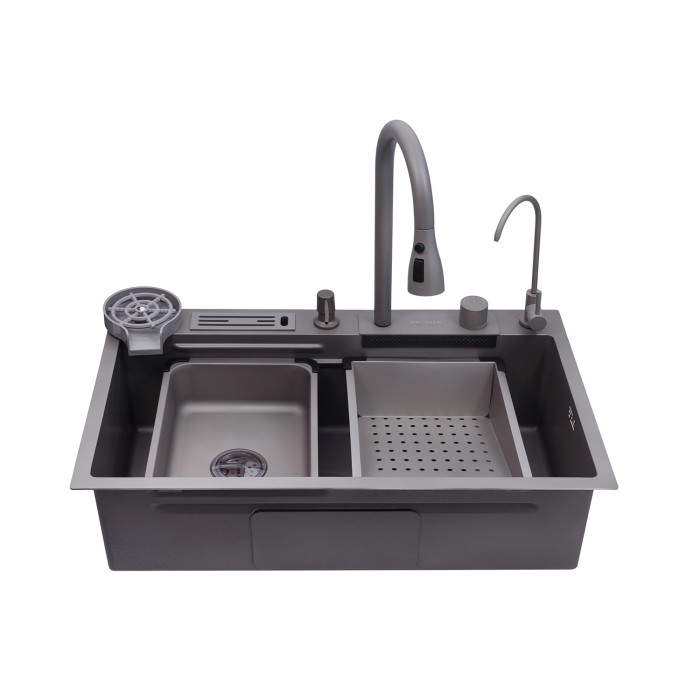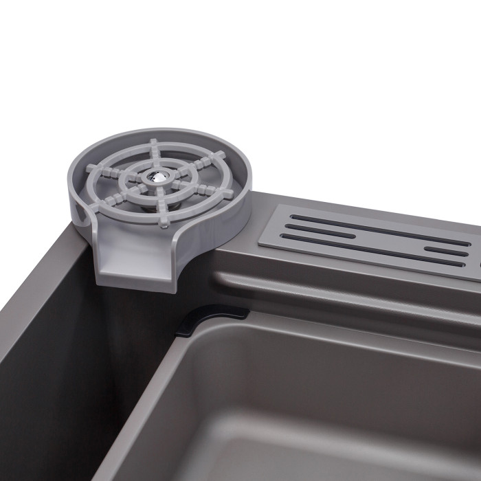 Мийка, змішувач, кран "Крапля", ополіскувач для склянок, обробна дошка, коландер, піддон, дозатор для миючого засобу, зливна арматура, сифон