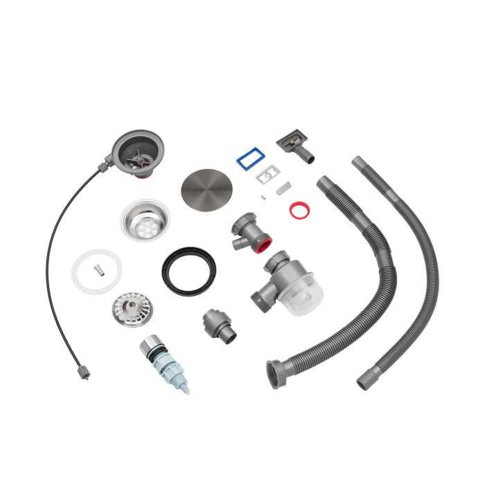 3. Комплектація: у комплекті з мийкою поставляється повний набір необхідних аксесуарів для комфортної роботи на кухні, таких як ополіскувач склянок, обробна дошка з цільного дерева, сифон, кошики для миття, дозатор для мийного засобу, змішувач з висувним виливом, кран "Крапля" для фільтрованої води.