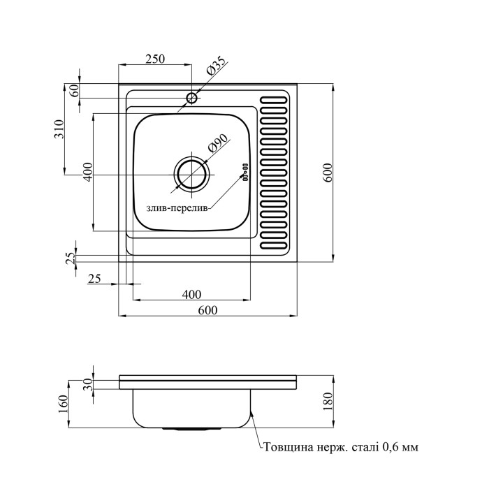 Кухонна мийка накладна Kroner KRP Satin - 6060L (0.6 мм)