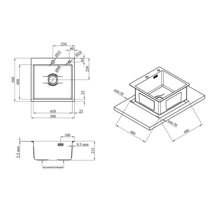 Кухонна мийка Kroner KRP Derby - 5050HM PVD (2,5/0,5 мм)