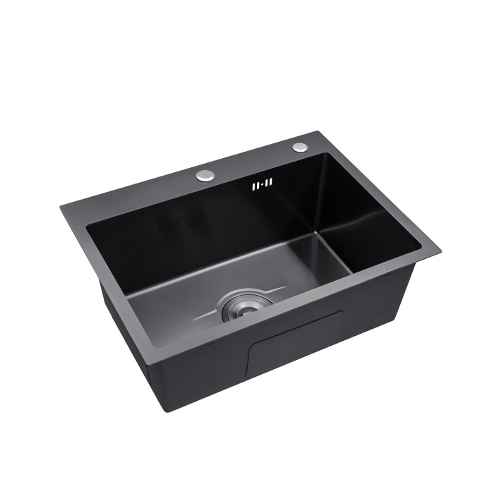 Кухонна мийка Kroner KRP Derby - 5843HM PVD (2,5/0,5 мм) - це стильне і функціональне рішення для вашої кухні. Маючи прямокутну форму з розмірами 580 мм в ширину і 430 мм в глибину, ця мийка стане відмінним доповненням до будь-якої кухні. Вона має висоту 215 мм і виготовлена із нержавіючої сталі, що робить її міцною і довговічною. Ця мийка має інтегрований спосіб монтажу і пропонує три варіанти установки: рівень із стільницею, над стільницею (подібно до врізних мийок) і під нею. Це надає вам можливість вибору оптимального розташування для вашої кухні. Графітовий колір мийки та поверхня PVD додають їй елегантний вигляд і роблять її сучасною. Мийка обладнана переливом і сифоном для зручного користування. В комплект входять сама мийка, сифон, злив-перелив та кошиковий вентиль, що робить встановлення і використання цієї мийки легкими і зручними.