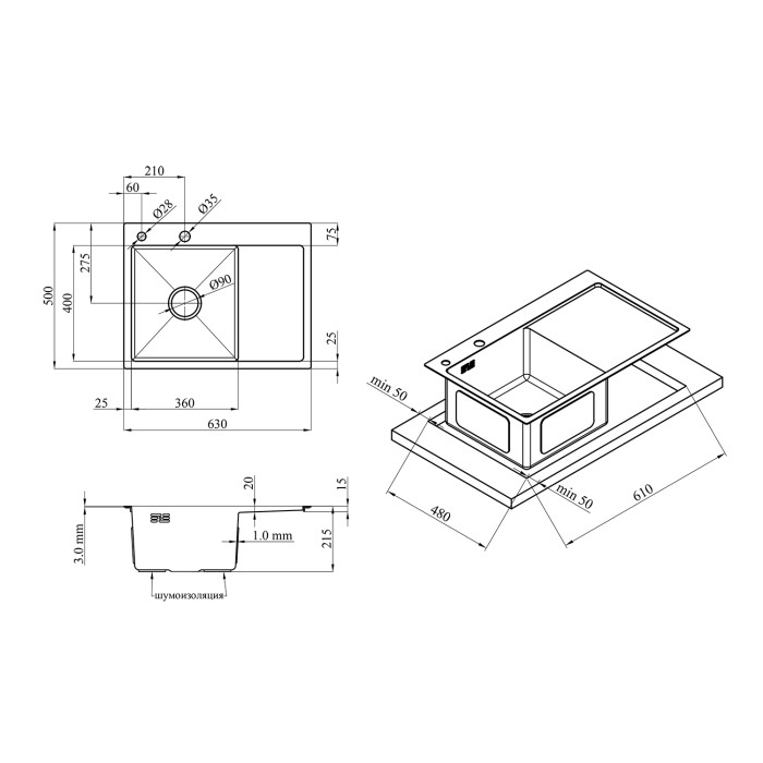 Кухонна мийка Kroner KRP Gebürstet - 6350LHM (3.0/1.0 мм) виготовлена з високоякісної нержавіючої сталі харчової марки, що дозволить виробу прослужити довгі роки. Відмінна якість та дизайн миття дозволять задовольнити найвищі вимоги та створити затишок у вашому будинку! Випуск сифону виготовлений з нержавіючої сталі зі сміттєзбірником у формі цебра і закривається пробкою-кришкою, яку можна використовувати за необхідності набрати води в чашу. Мийка обладнана переливом для відведення води в екстрених випадках. Інтегрований спосіб монтажу дозволяє встановлювати мийку в будь-якому можливому варіанті, класичному врізному - над стільнею, інтегрованому - мийка встановлюється в рівень зі стільнею, і монтаж під стільню.