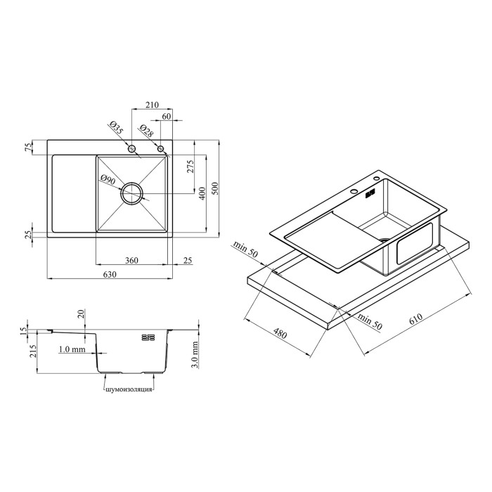 Кухонна мийка Kroner KRP Gebürstet - 6350RHM (3.0/1.0 мм) виготовлена з високоякісної нержавіючої сталі харчової марки, що дозволить виробу прослужити довгі роки. Відмінна якість та дизайн миття дозволять задовольнити найвищі вимоги та створити затишок у вашому будинку! Випуск сифону виготовлений з нержавіючої сталі зі сміттєзбірником у формі цебра і закривається пробкою-кришкою, яку можна використовувати за необхідності набрати води в чашу. Мийка обладнана переливом для відведення води в екстрених випадках. Інтегрований спосіб монтажу дозволяє встановлювати мийку в будь-якому можливому варіанті, класичному врізному - над стільнею, інтегрованому - мийка встановлюється в рівень зі стільнею, і монтаж під стільню.