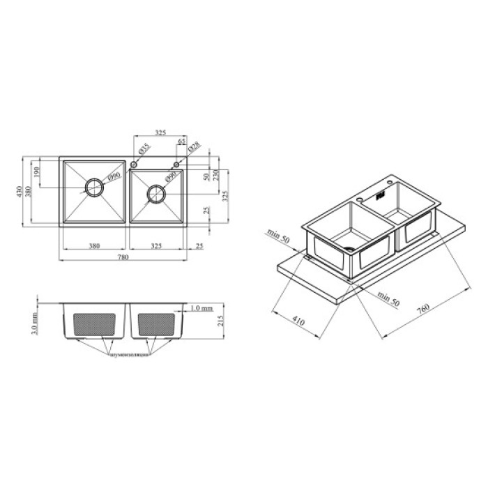 Мойка, сифон, слив-перелив, корзинный вентиль, сушка.