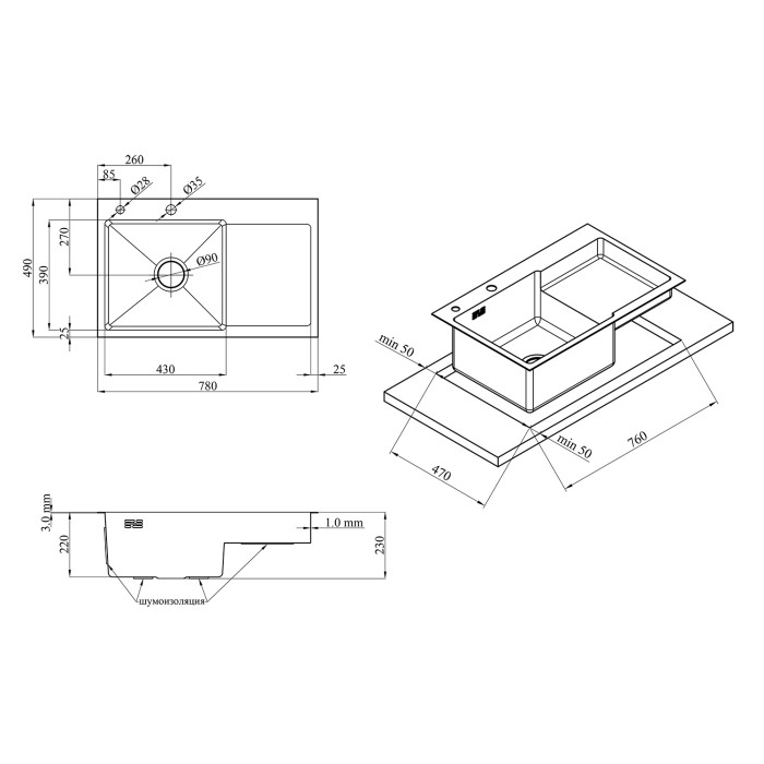 Мийка, сифон, злив-перелив, кошиковий вентиль, сушарка.