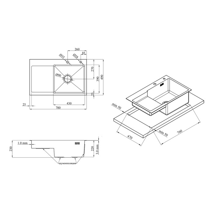Мийка, сифон, злив-перелив, кошиковий вентиль, сушарка.