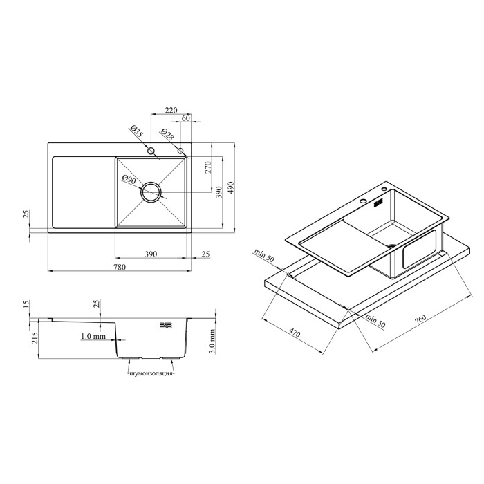Толщина материала мойки, мм