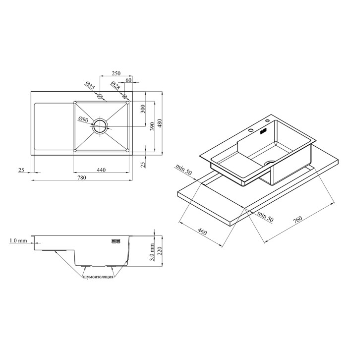 Мийка, сифон, злив-перелив, кошиковий вентиль, сушарка.